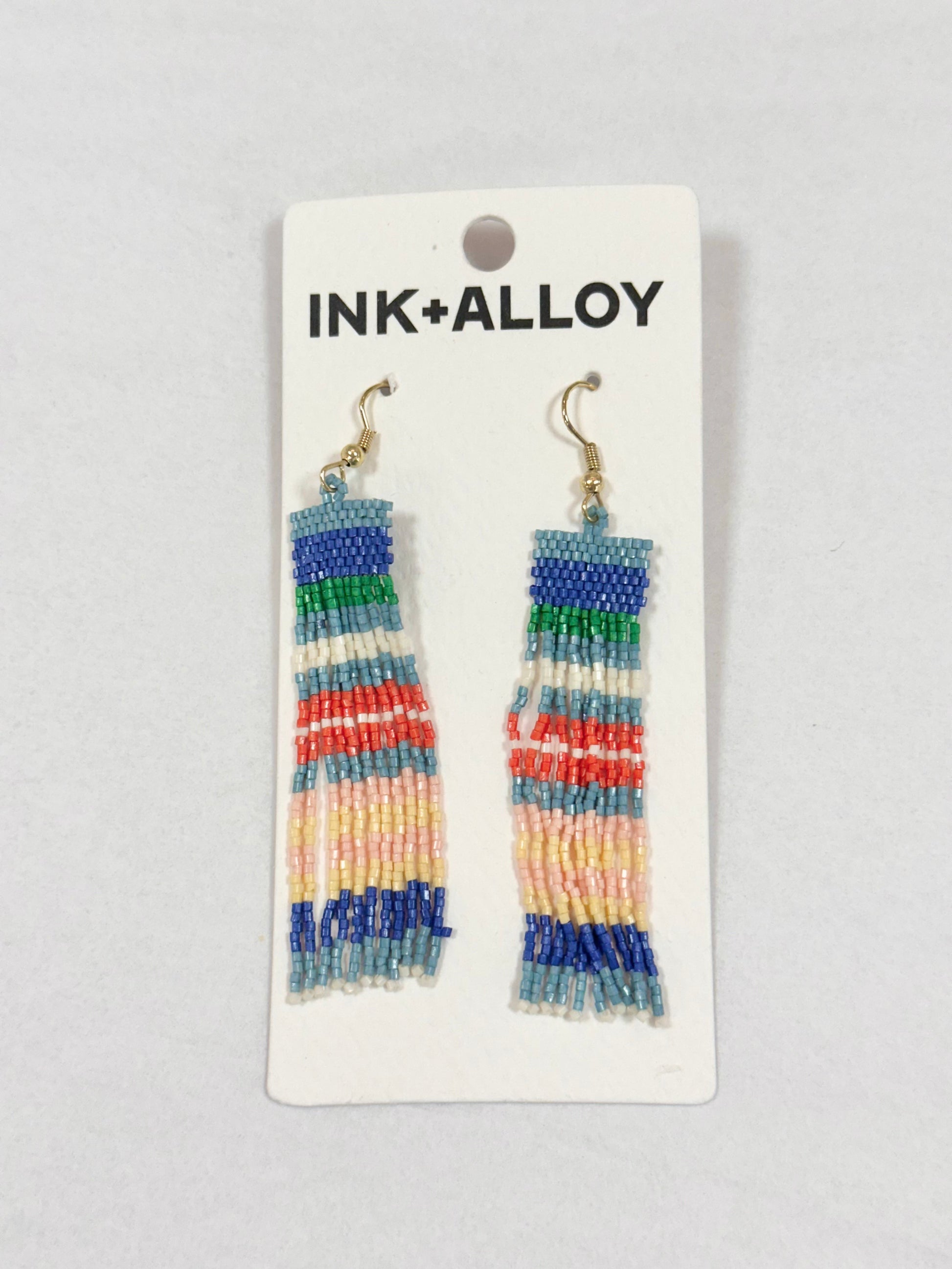 INK + ALLOY beaded fringe earrings. Handmade in India. Metal hook style. 1/2'' x 31/4''