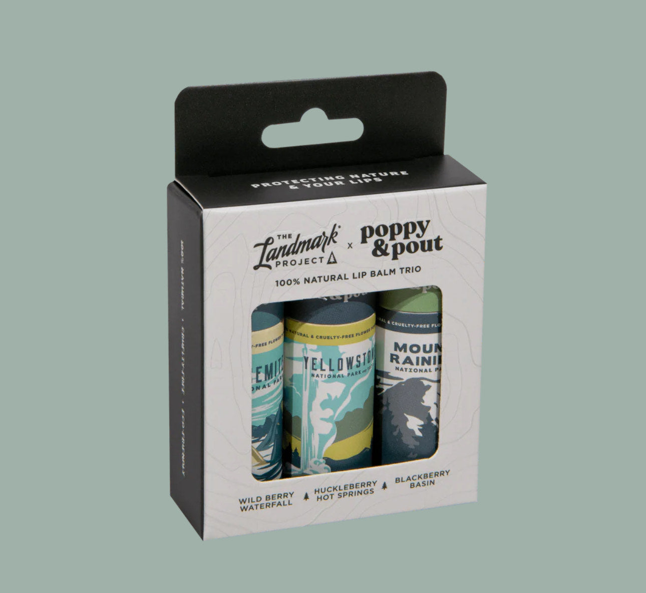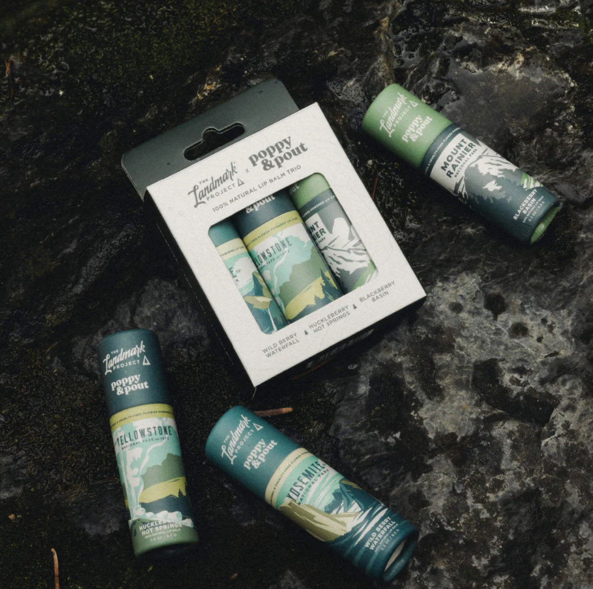 The Mountain Trio comes with three lip balms, Mount Rainier Blackberry Basin, Yellowstone Huckleberry Hot Springs, and Yosemite Wild Berry Waterfall.